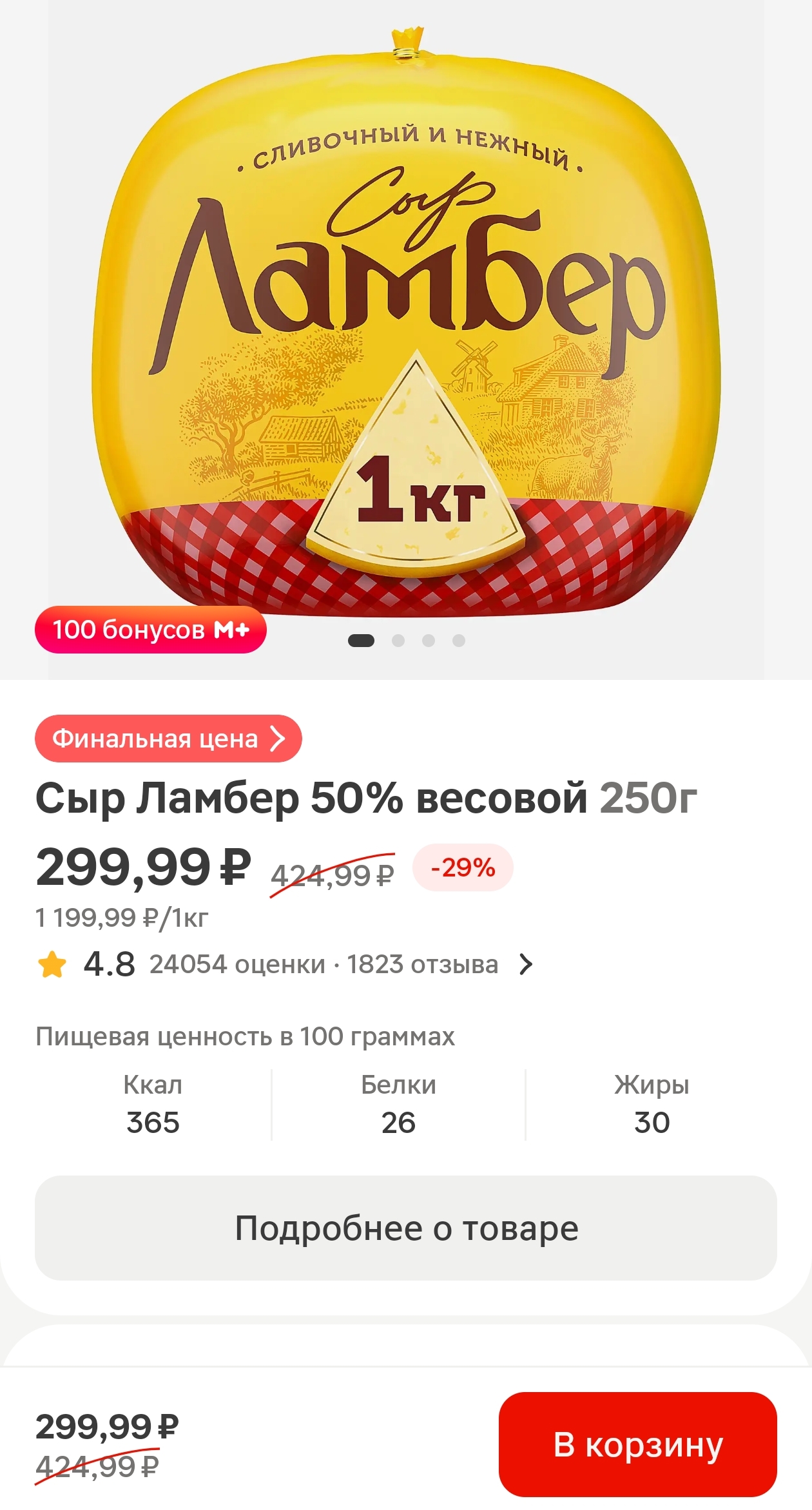 Если добавить в корзину 4 шт, то за 1 кг начислят 400 бонусов на карту Магнит. Потом бонусы можно потратить на любые продукты 1 к 1 до 50% от чека даже в магазине.