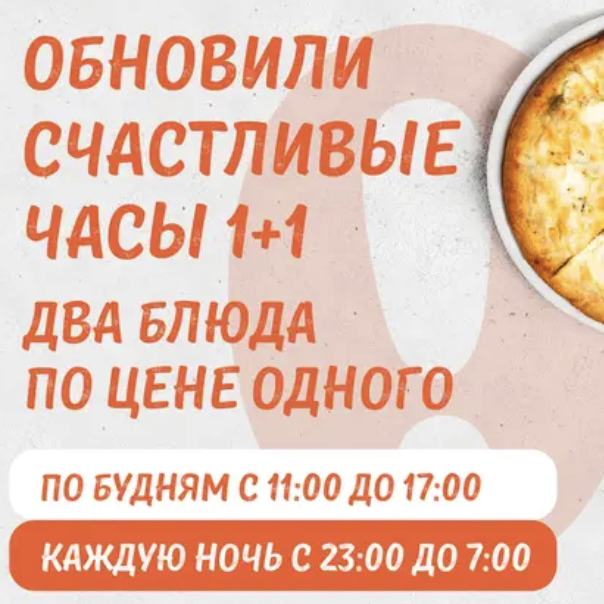 В будние дни с 11:00 до 17:00 и каждую ночь с 23:00 до 07:00 действует акция: при заказе одного блюда из специальной подборки «1+1» второе предоставляется бесплатно.