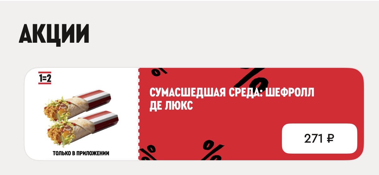 У них по средам проходит акция, работает через приложение, на главной странице сразу будет купон 5050. Сегодня отдают два шефролла де люкс по цене одного, можно взять оригинальный или острый. Оформляете самовывоз и получаете два ролла, платите как за один. Правда, цена в итоге от региона зависит, у кого то может дешевле или наоборот.