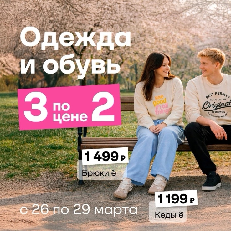 В розничных магазинах и онлайн с 26 по 29 марта можно купить одежду и обувь по акции 3=2 (с наименьшей ценой будет в подарок). Участвует ограниченный ассортимент.