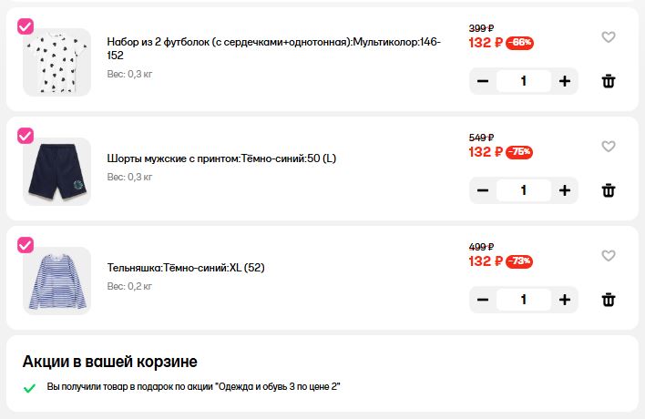 При покупке в интернет-магазине нужно добавить 3 вещи в корзину, скидка применится автоматически. Количество ограничено.