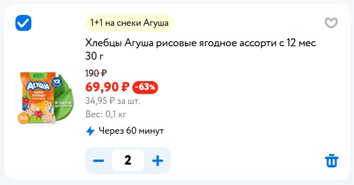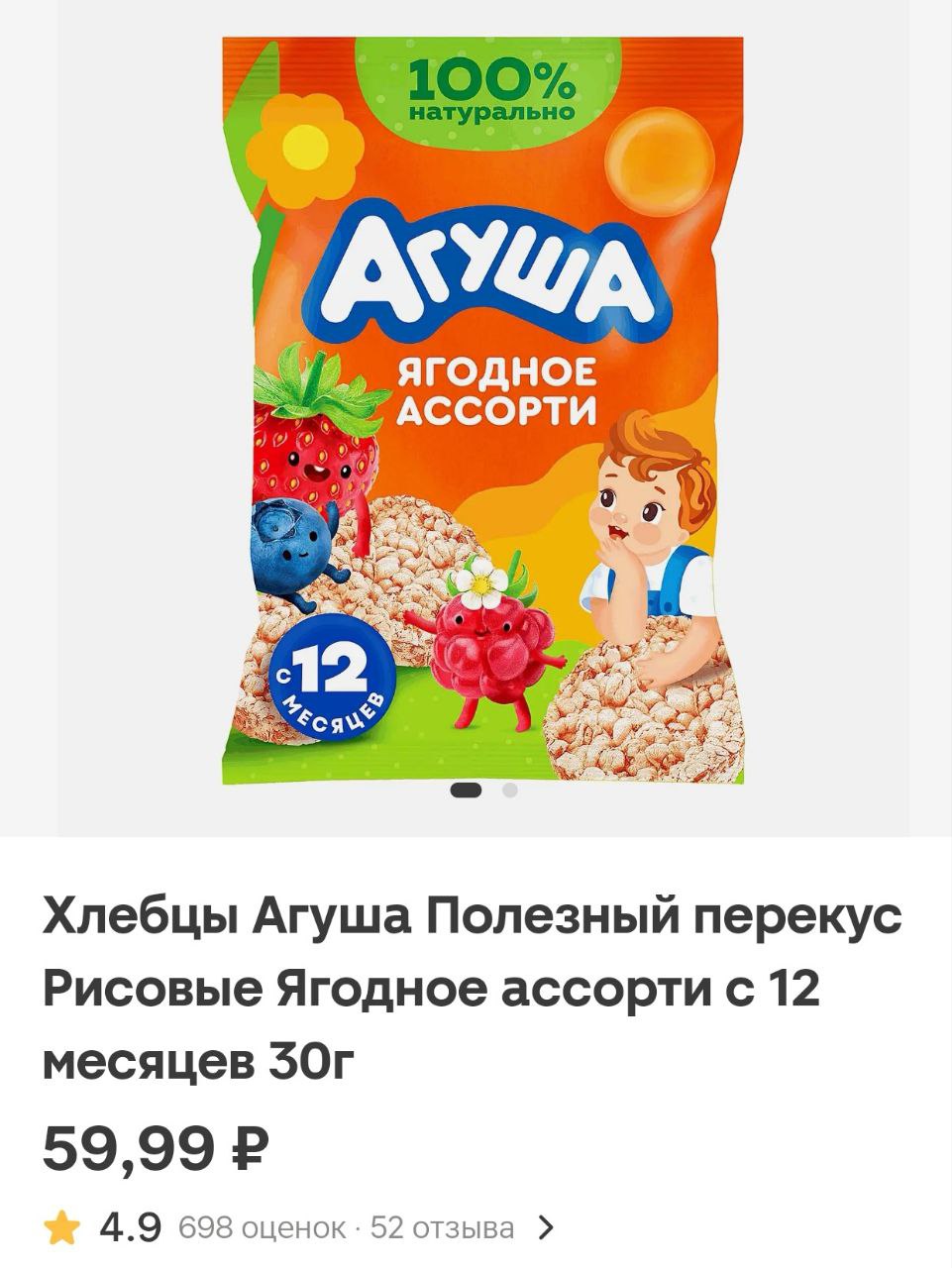 Часто покупаю рисовые хлебцы Агуша в Магните у дома, когда хочется пожевать что-нибудь сладкое и не оч калорийное. Только вот в Магните цена 60 руб, а в Детском мире по акции выходит 35 рублей за пачку! Нормально так я переплачиваю 😭 Сейчас буду оформлять заказ. Кстати, в каталоге ещё есть фруктовые батончики и кусочки, но для меня они слишком приторные.