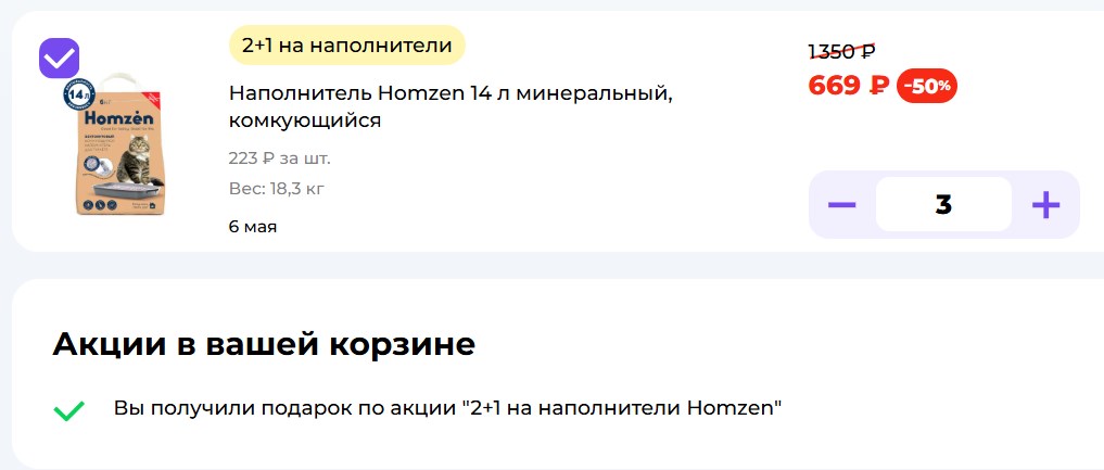 Берёшь три наполнителя Homzen из акционного ассортимента - один (самый дешёвый) в подарок. Плюс скидки до 30%. Можно купить в магазинах «Зоозавр» или в интернет-магазине. Акция до 30 апреля.