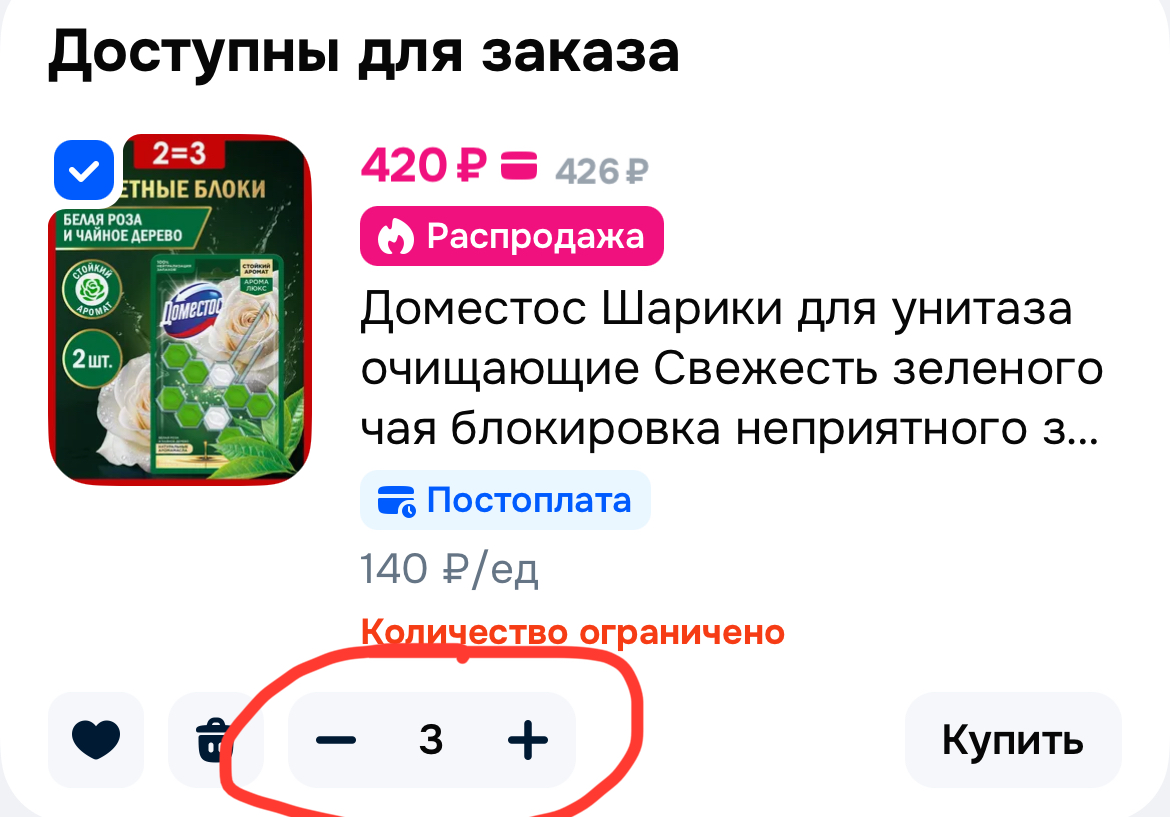 Нашел акцию на туалетные блоки и чистящие средства. Нужно положить 3 товара и цена за самый дешевый распределится как скидка на всю корзину.