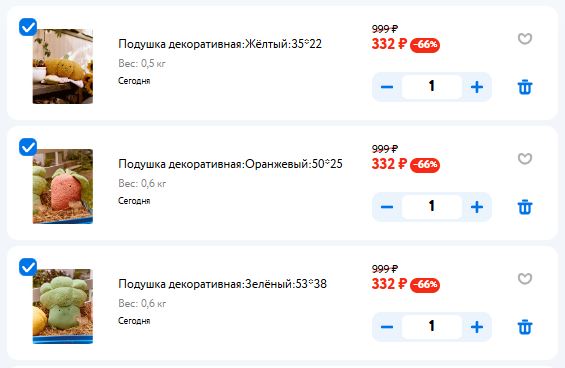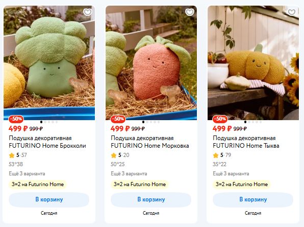 Прикольные игрушки, подушки, пледы и т.д. По акции 3=2 можно собрать комплект со скидкой. Если добавить в корзину 3 штуки, цена пересчитается автоматически. Например, подушки-овощи по 499₽: