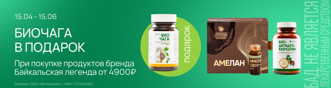 При заказе продуктов Байкальская легенда от 4900 ₽ БиоЧага добавляется в корзину автоматически. Один подарок на заказ, количество заказов не ограничено. Пока есть подарки в наличии. Акция может завершиться раньше.