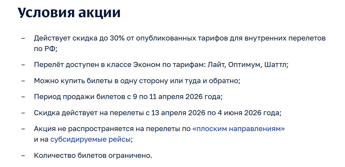 Всего 3 дня, с 9 по 11 апреля, скидки на перелёты по России на более 100 направлений, включая «Аэрофлот Шаттл» Москва - Питер и программу частых рейсов. Скидка действует даже на билеты на майские праздники!