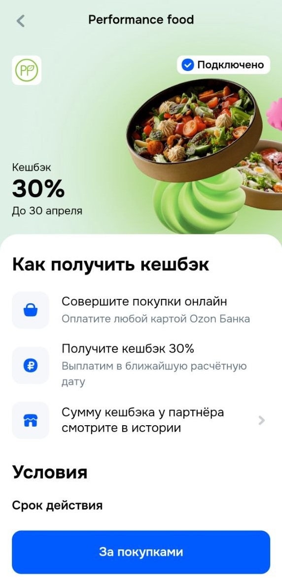 Активируй акцию в Ozon Банке: совершай онлайн покупки на сайте Performance food и оплачивай любой картой Ozon Банка до 30 апреля включительно. 30% кешбэка начислят в ближайшую расчётную дату. Предложение суммируется со всеми скидками, но доступно не для всех (проверяй у себя).