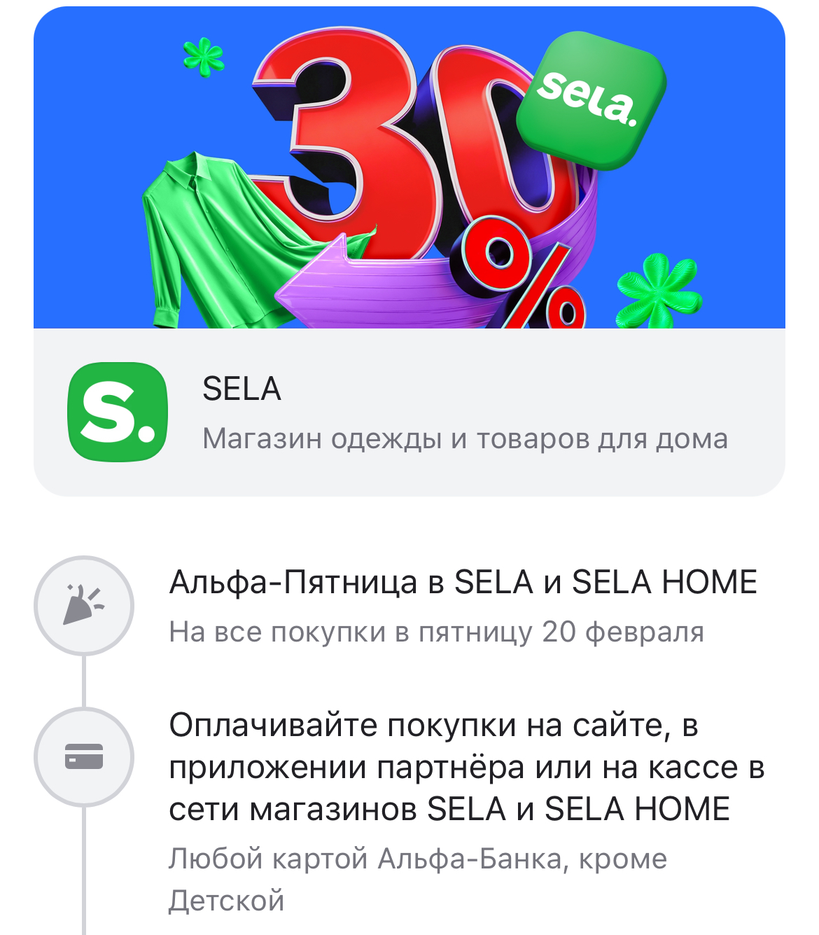 • Кэшбэк до 30% на покупки в магазине SELA на покупку в пятницу, 20 февраля. Максимум - 3000 рублей