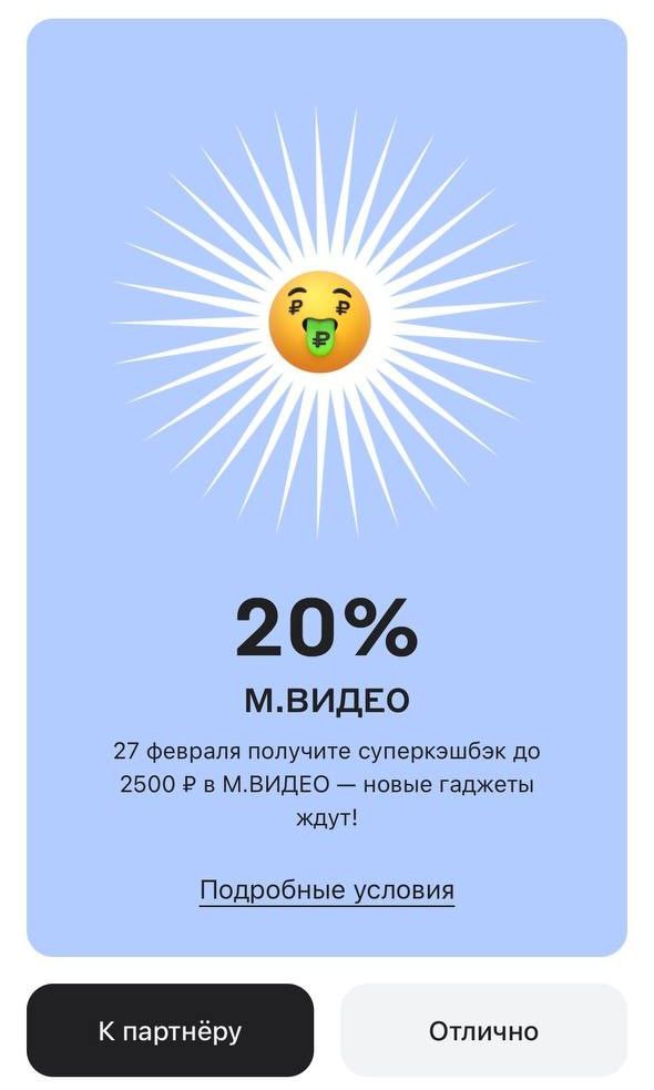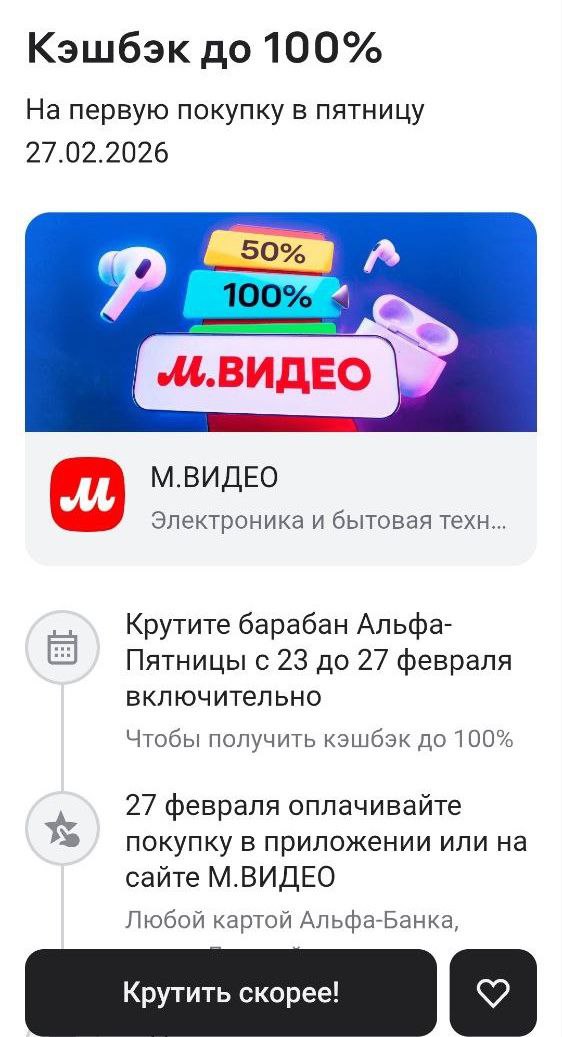 В приложении Альфа сегодня можно покрутить барабан и получить от 10% до 100% кэшбэка на покупку онлайн в М.Видео. Максимальный размер кэшбэка в рублях зависит от процента, выпавшего в барабане. Зачисление обещают 10 марта.