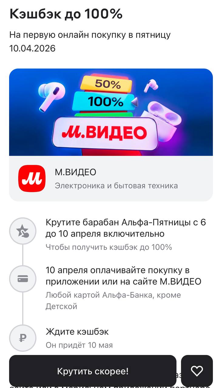 В приложении Альфа уже можно крутить барабан, чтобы получить от 10% до 100% кэшбэка на покупку онлайн 10 апреля в М.Видео. Максимальный размер кэшбэка в рублях зависит от процента, выпавшего в барабане. Зачисление обещают 10 мая.