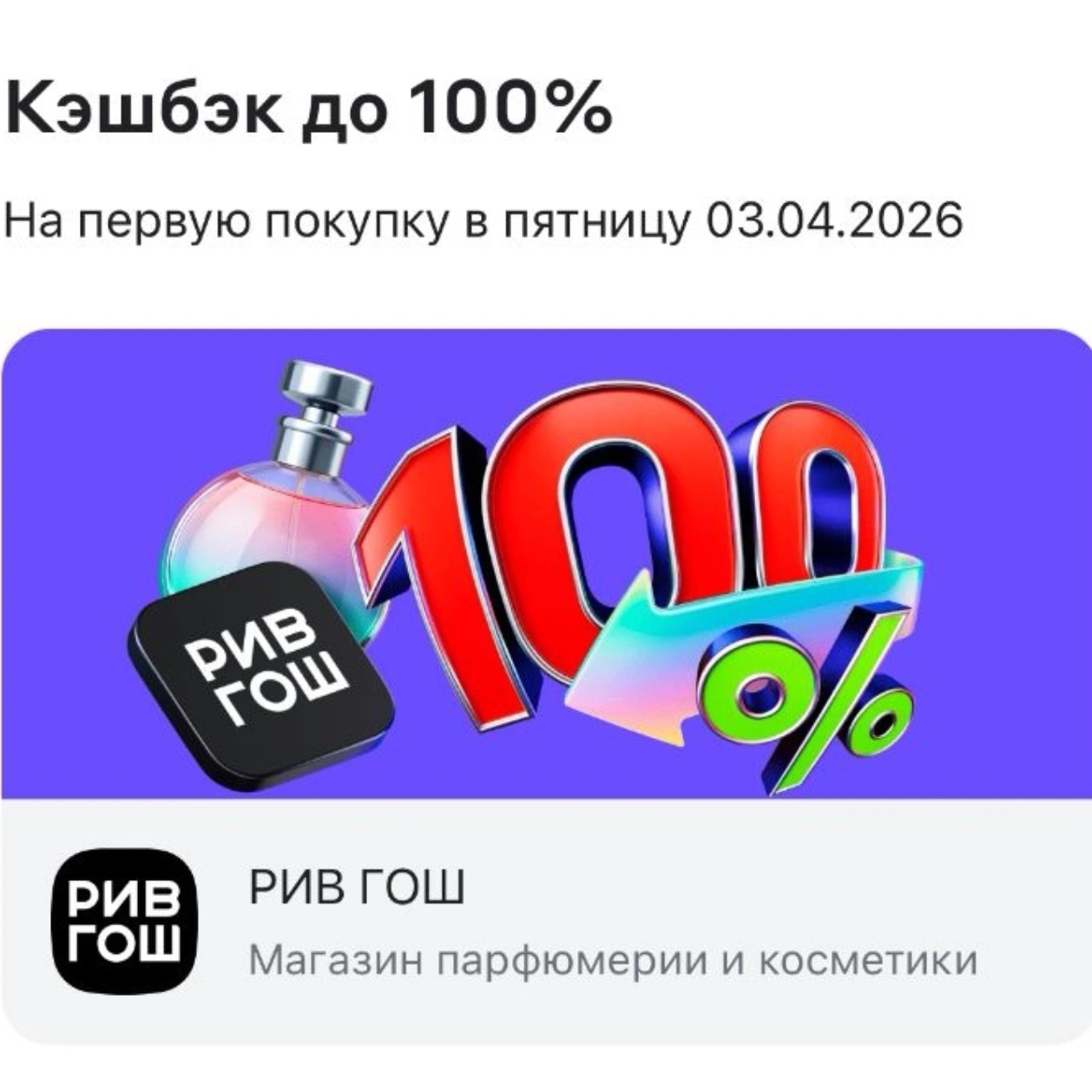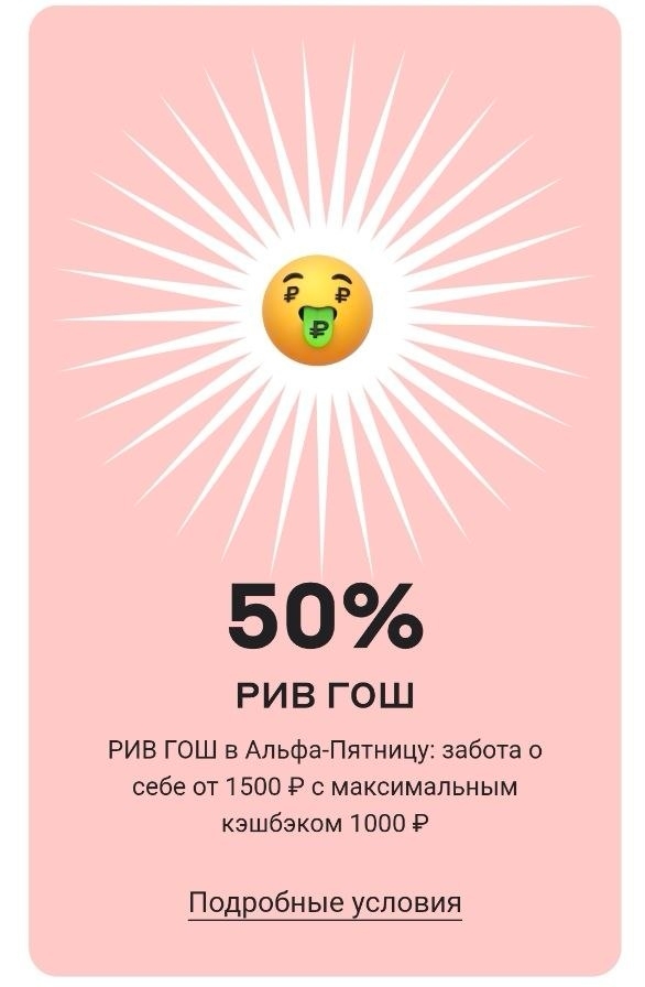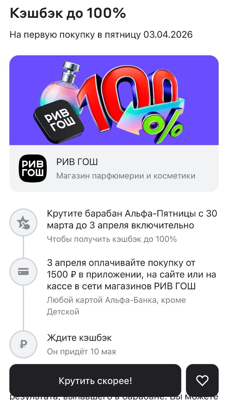 Сегодня можно получить кэшбэк до 100% на покупку в РИВ ГОШ от 1500₽ онлайн или в магазинах при оплате Альфа-Картой. Но сначала крутим барабан в приложении Альфа, чтобы узнать % и размер макс.кэшбэка, оплачиваем покупку именно 3 апреля.