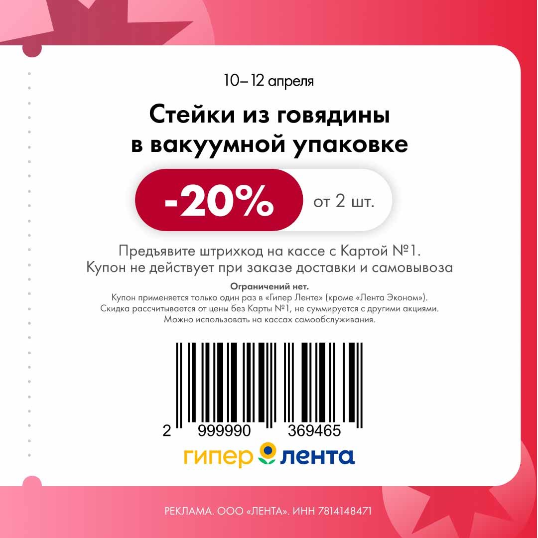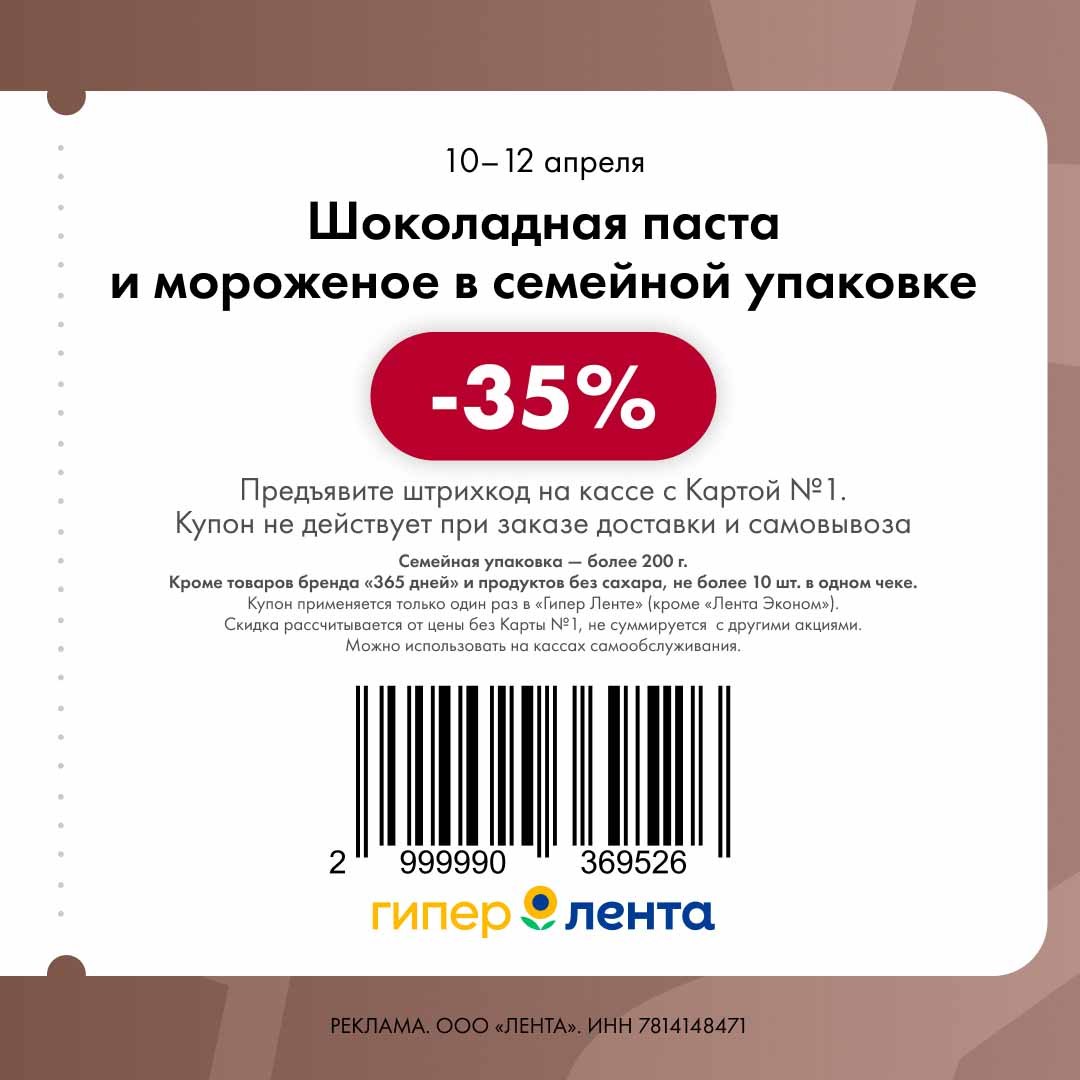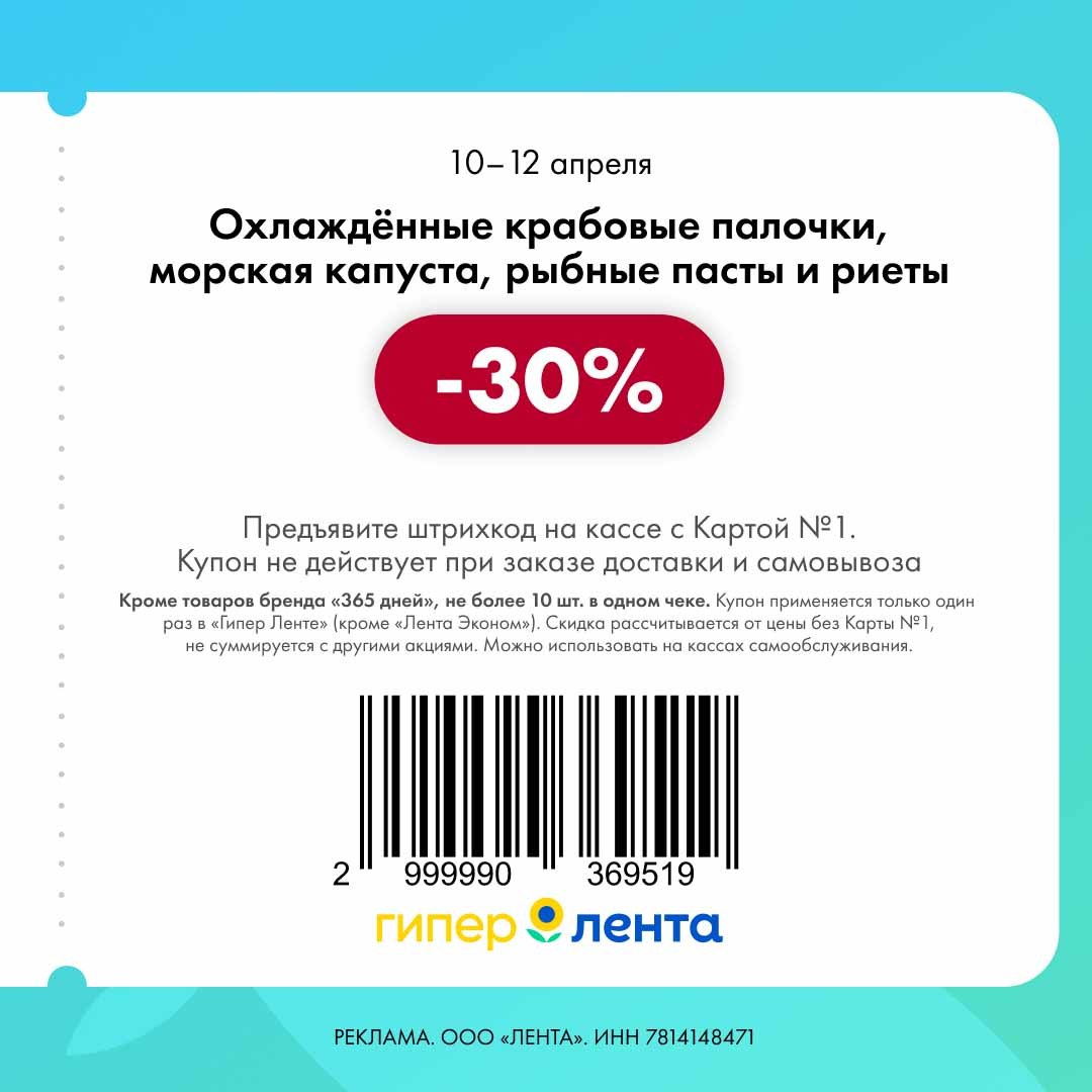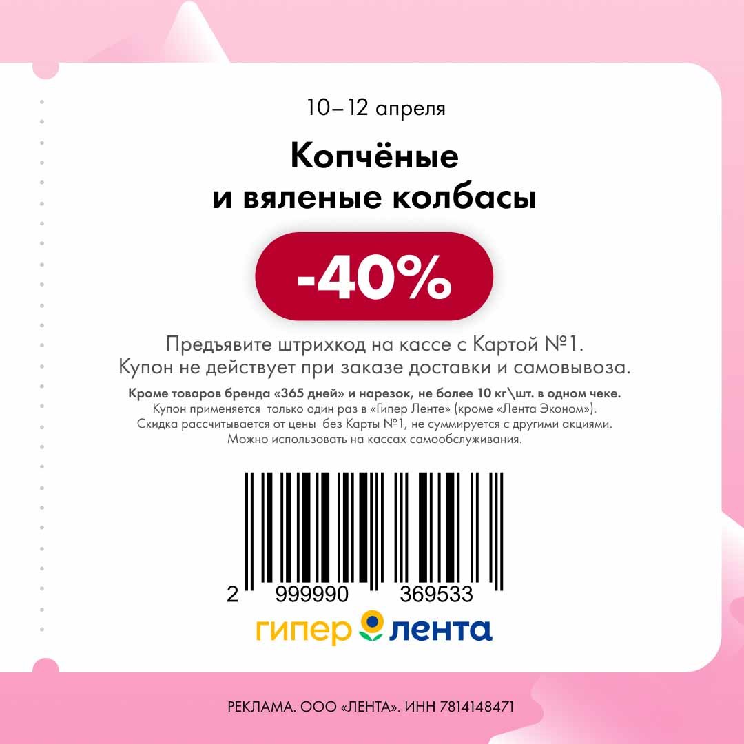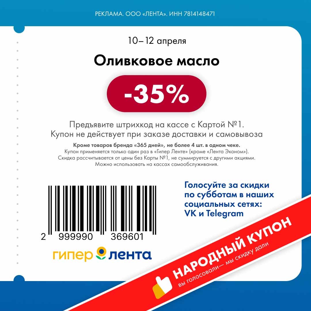 В группе Ленты нашла новые купоны. Скидка проходит от полной цены.