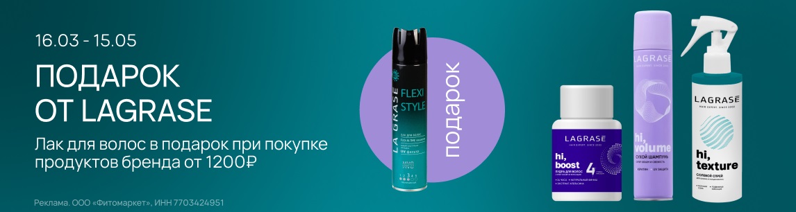 При покупке продуктов La Grase на сумму от 1200 ₽ к заказу автоматически добавится лак для волос FLEXI STYLE. Один подарок на заказ, количество заказов не ограничено. Акция действует, пока есть подарки в наличии, может завершиться досрочно.