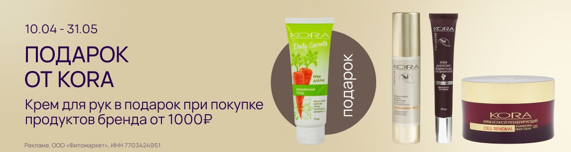 При покупке продуктов KORA на сумму от 1000 ₽ к заказу автоматически добавится крем для рук Витаминный уход, 75 мл. Один подарок на заказ, количество заказов не ограничено. Акция действует, пока есть подарки в наличии, может завершиться досрочно.