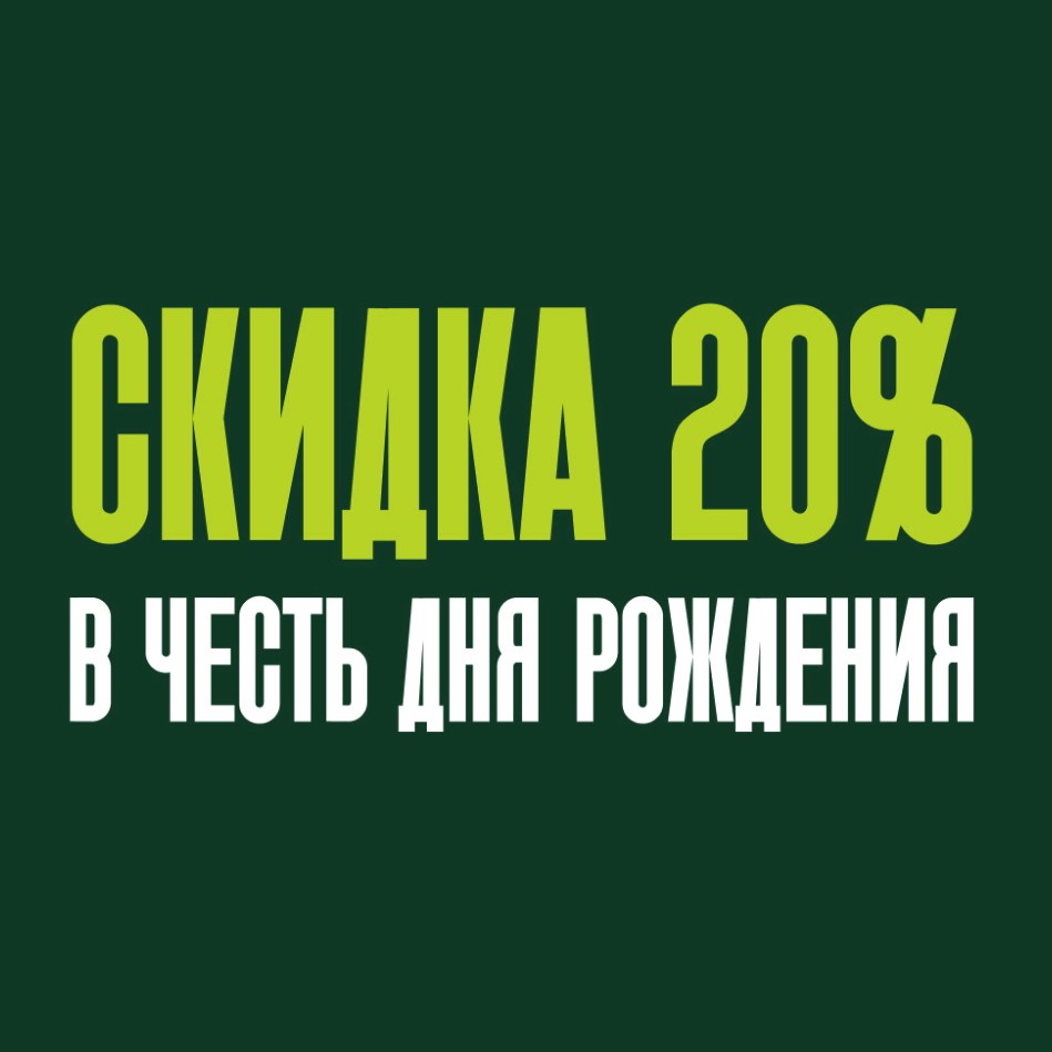 Скидку 20% от любой стоимости можно получить в День Рождения, 3 дня до и 3 дня после при предъявлении паспорта. Не суммируется с другими акциями и скидками.