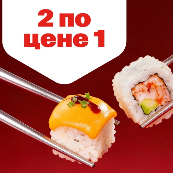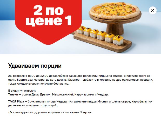 Оформляем заказ на сайте или в приложении TanukiFamily - ресторан Тануки или Твоя Пицца. Добавляем в корзину 2 пиццы или ролла из списка, а платим за один. Количество неограниченно. Главное добавлять по две одинаковых позиции.