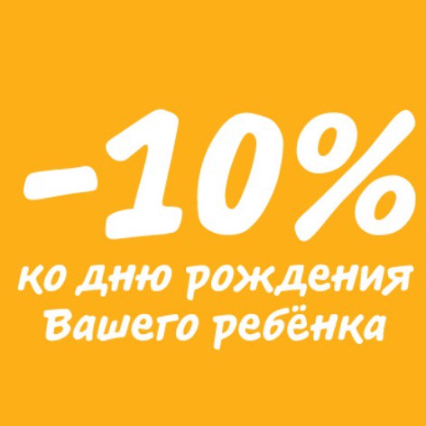 Получи скидку 10% на один чек в честь дня рождения ребёнка. Скидка действует за 5 дней до даты, в день рождения и 5 дней после. Доступна 1 раз в год.
