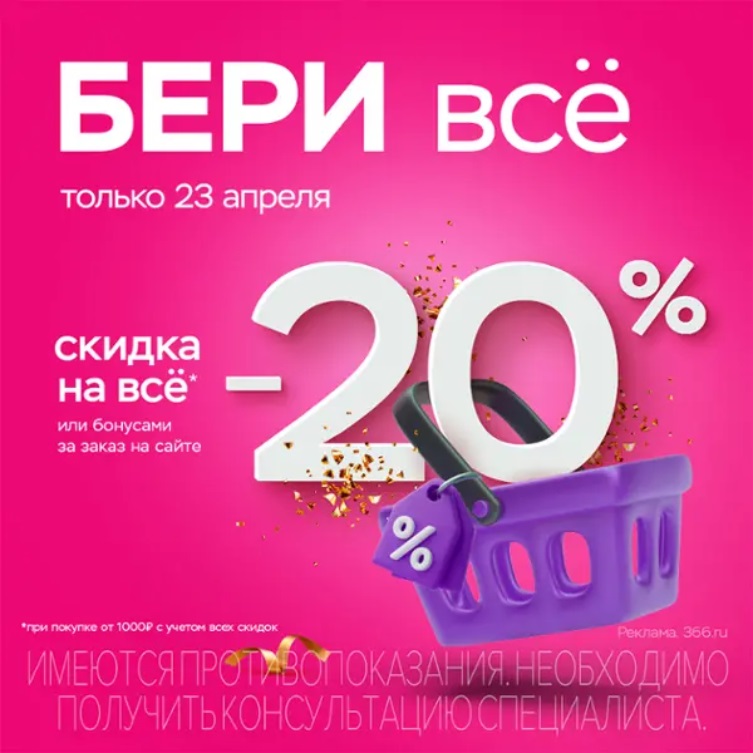 Всего один день вы можете купить любые товары в аптеке со скидкой 20%, если сумма заказа от 1000 рублей. При оформлении онлайн скидку вы получите бонусами на карту Клуба «36,6».