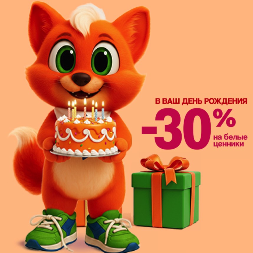 Скидка 30% действует в День рождения, а также за 3 дня до и 3 дня после. Предоставляется при предъявлении паспорта. Не действует на бытовую химию, товары для ухода и красоты, гигиены, товары импульсного спроса, пакеты для покупателей. Не суммируется со скидками, акциями, бонусами и промокодами.