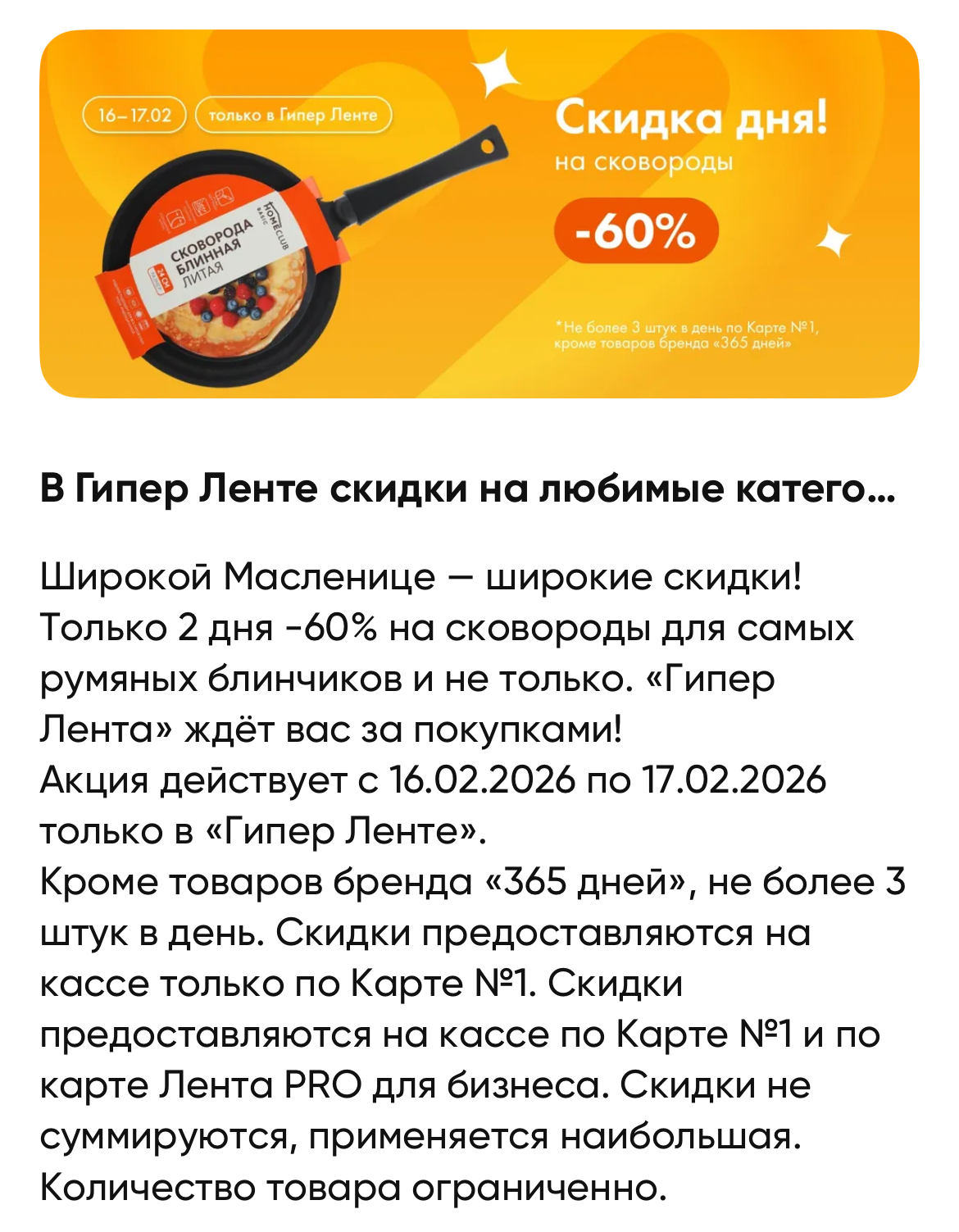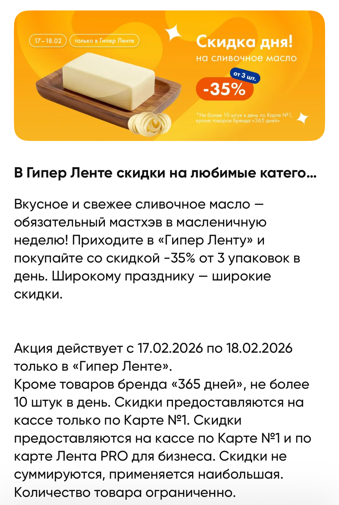 Нашли акцию в приложении. Скидка сработает на кассе магазина при предъявлении карты Ленты. Не суммируются со скидками (применится максимальная), потому нужно выбирать что выгоднее.