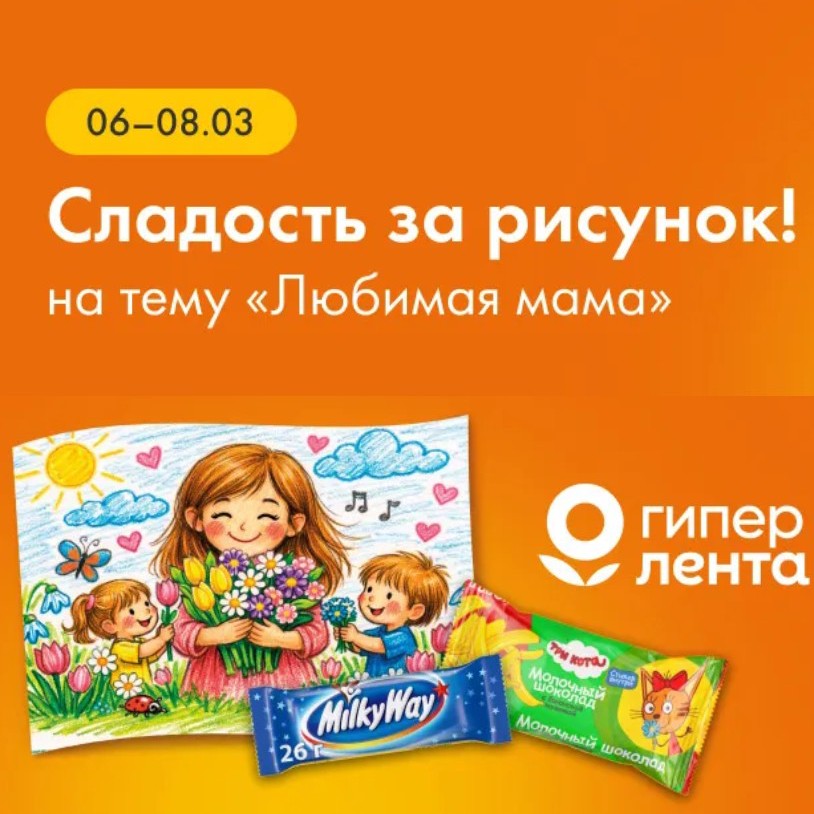 Пусть ваш ребёнок нарисует маму и принесёт рисунок в Гипер Ленту до 8 марта. На стойке информации за рисунок дадут два шоколадных батончика: Milky Way и Три кота с бананом.