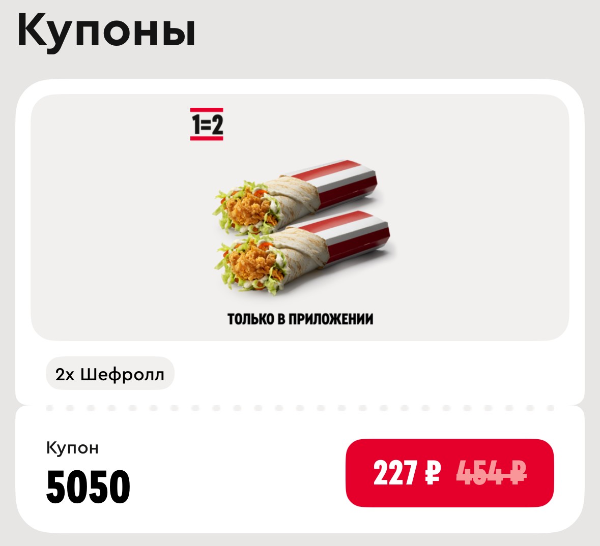 В приложении на главной сразу висит купон 5050. Сегодня по нему можно взять два шефролла, а заплатить за один. Не сработает на доставку, только самовывоз.