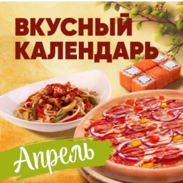 2, 8, 14, 22, 28 апреля оформляй заказ от 1599₽, вводи промокод дня и получай подарок на выбор: пицца Гурман 26 см или Калифорния Чиз или Удон с курицей
