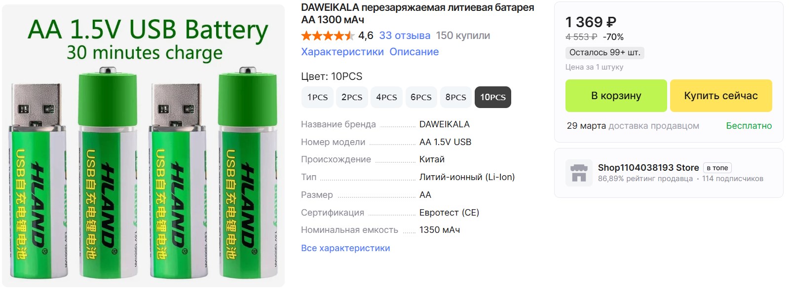 Привет. На Али сейчас перезаряжаемые литиевые батарейки AA, 10 штук за 1369₽ - это самый выгодный набор. Ёмкость 1300 мАч, напряжение 1.5 В. Заряжаются через USB - снимаешь колпачок и вставляешь в любой порт. Индикатор показывает процесс, полная зарядка за полчаса.