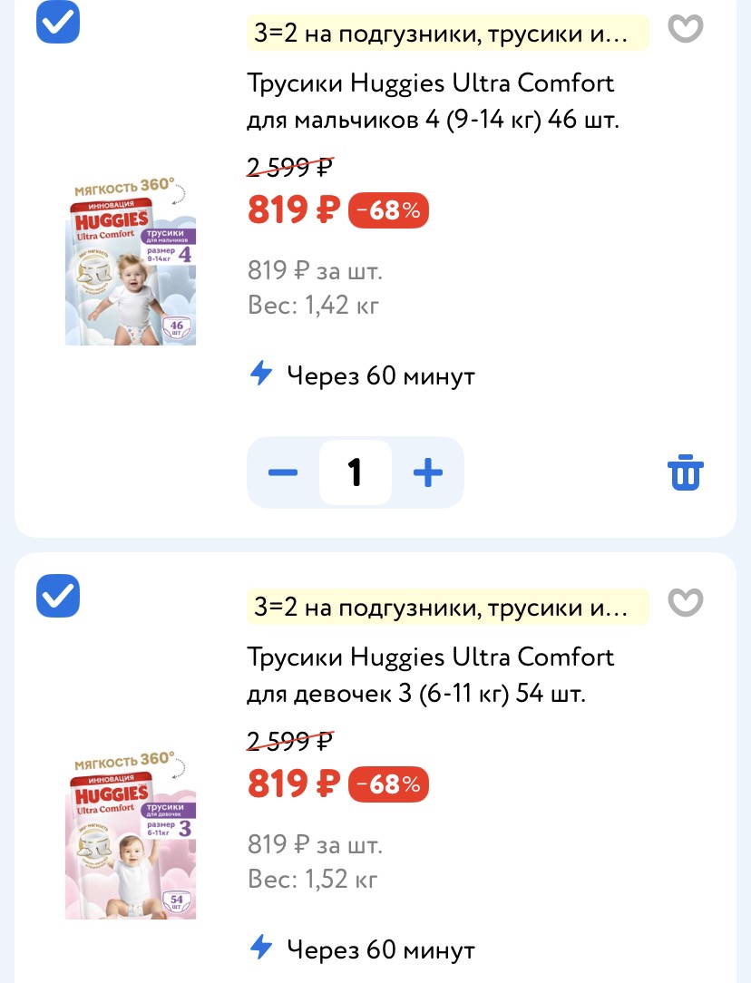 ▪️ 3=2 на подгузники, трусики и салфетки Huggies
