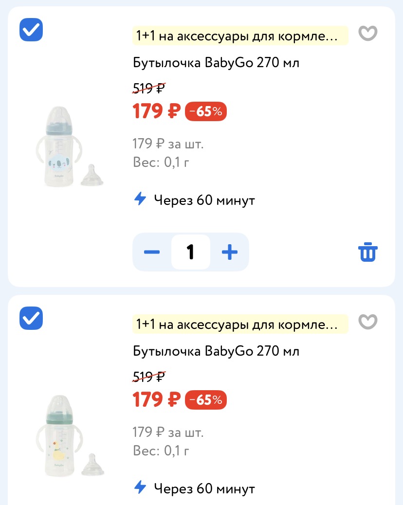 Также кладем 2 товара и переходим в корзину. Скидка сработает автоматически и распределится на все товары акции.