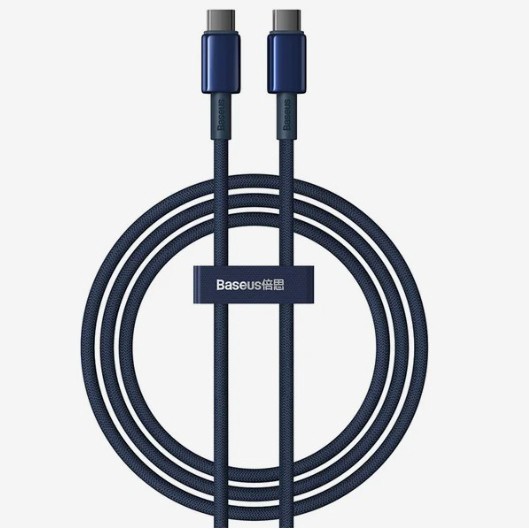 Это качественный кабель от Baseus с двумя разъёмами Type-C и длиной 2 метра. Оплётка нейлоновая, штекеры усилены защитой от перегибов. Поддерживает ток до 5А и мощность до 100 Вт: подойдёт для быстрой зарядки ноутбуков, планшетов и смартфонов. Выбрать можно из трёх цветов.