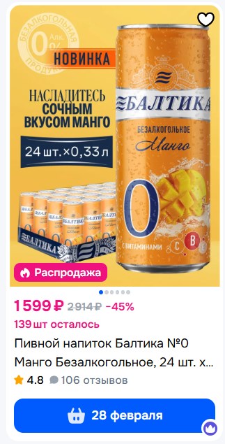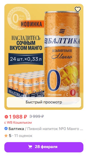 Безалкогольное, 330 миллилитров. Вкус манго с кислинкой и солодовыми нотками. Без сахара, 50 ккал на 100 г, витамины В, С и Е.