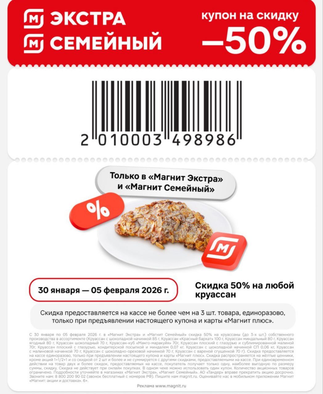 Акция до 4 февраля 2026 г. Скидка предоставляется на кассе не более чем на 3 шт. товара, единоразово, только при предъявлении настоящего купона и карты «Магнит плюс».
