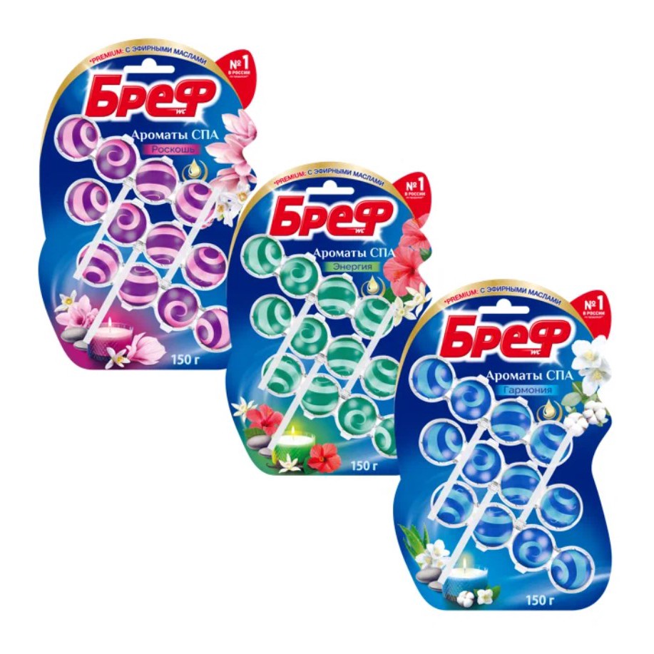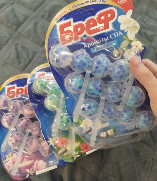 Нашла туалетные блоки Бреф сразу с тремя ароматами: Роскошь, Гармония и Энергия. На Яндекс Маркете набор из девяти штук за 675₽ - получается всего 75₽ за один блок, если посчитать.