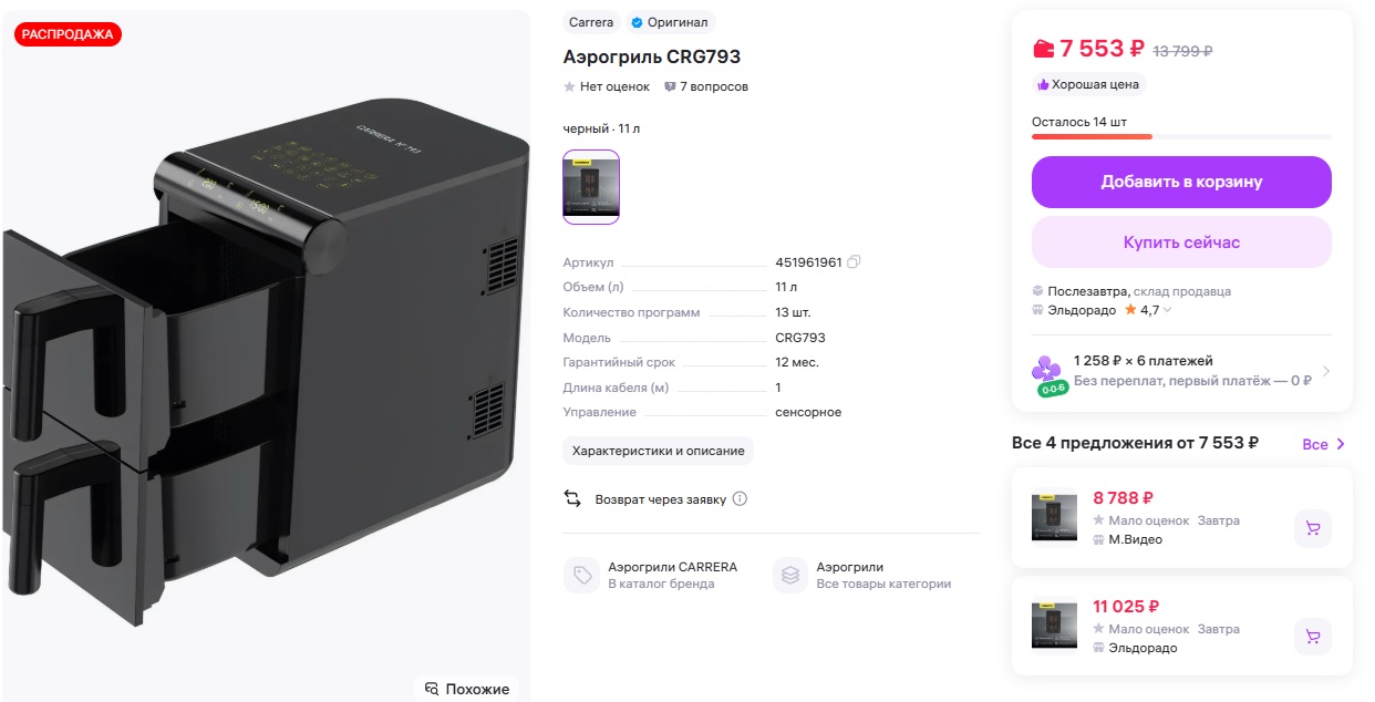 Зацените двойной аэрогриль на Маркете за 6426₽. Тут сразу 11 литров объема с двумя чашами по 5,5л. На большую семью то, что надо. Удобно, что чаши вертикально стоят, не горизонтально - меньше места будет занимать.
