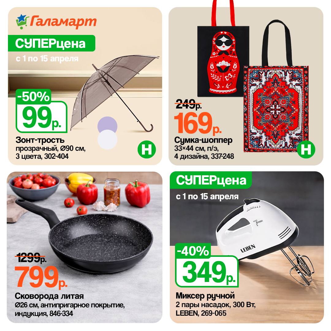 Товары по СУПЕРценам! Цены действительны с 1 по 15 апреля 2026 года. Цвета и некоторые детали товаров могут отличаться от изображённых в листовке. Товары по ШОК и СУПЕРценам можно приобрести только в розничных магазинах, они недоступны для заказа через интернет-магазин