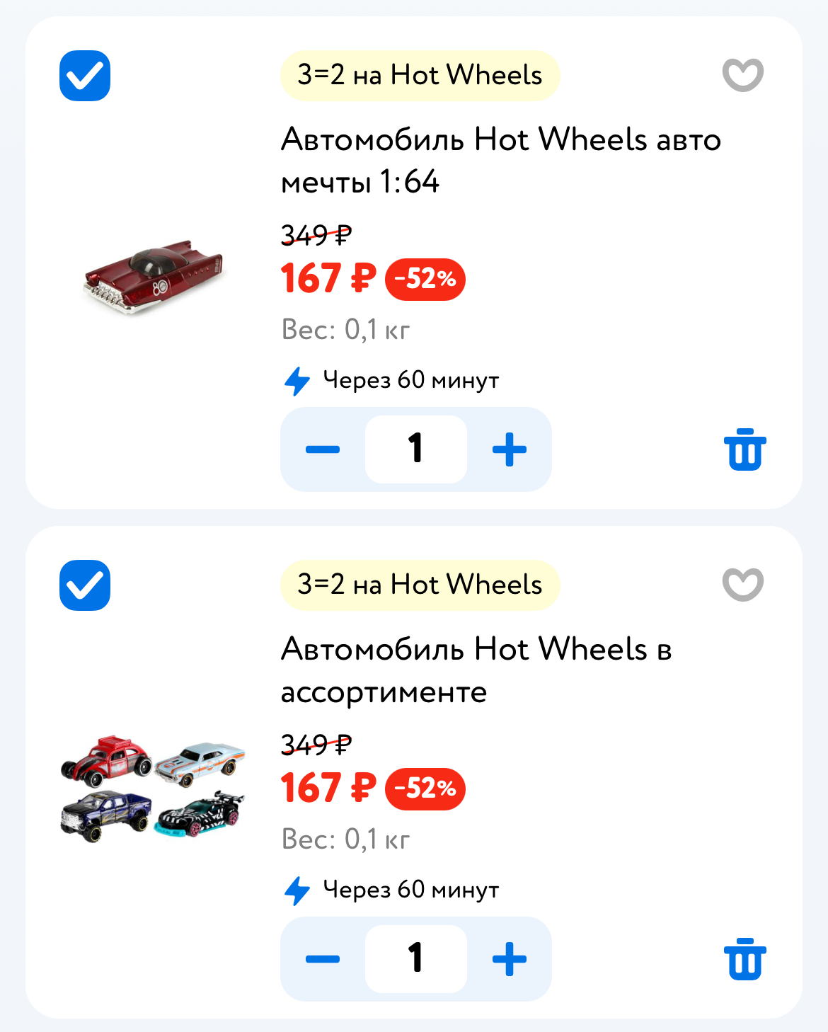 Взяла из описания акции: При покупке трех машинок Hot Wheels из ассортимента, участвующего в акции, одну из них с наименьшей ценой вы получаете в подарок.