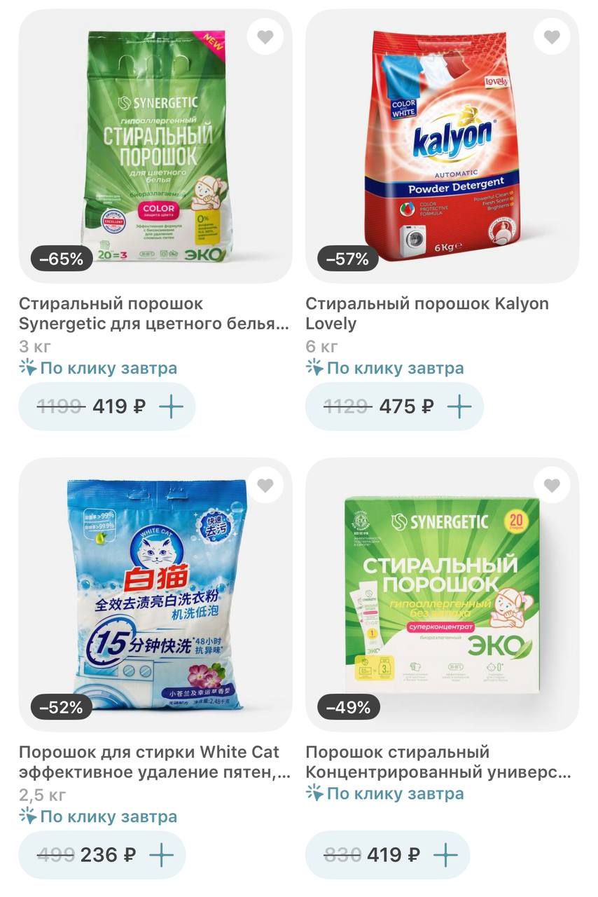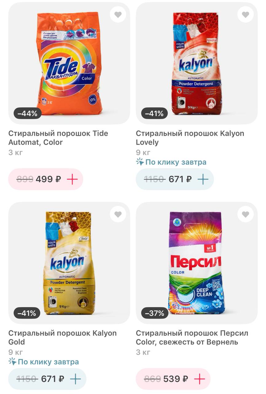 Нашла классные цены в каталоге Самоката. Нужно зайти в раздел с порошками и выставить сортировку "По размеру скидки". Ассортимент будет зависеть от города и адреса доставки.