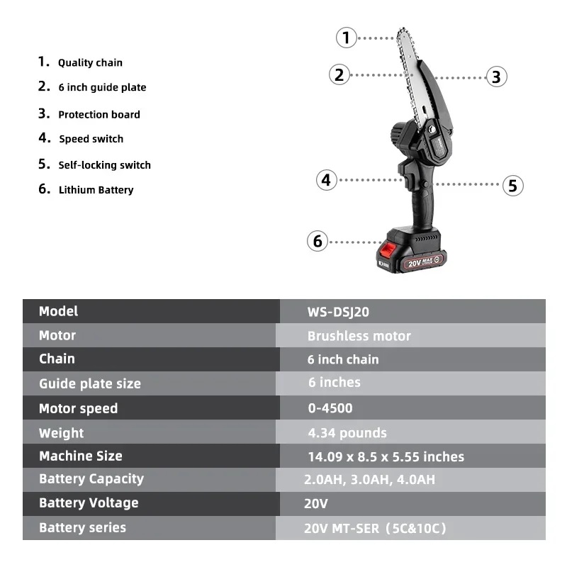 Двигатель бесщёточный, шина длиной 6", в комплекте идёт аккумулятор на 2 Ач напряжением 20В и зарядное устройство.