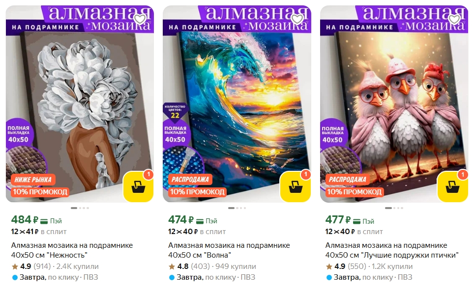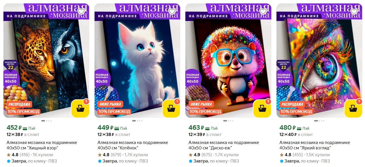 На Яндекс Маркете сейчас можно взять наборы для алмазной вышивки Art on Canvas с дополнительной скидкой 20% по промокоду. Холст уже натянут на подрамник, клеевая основа нанесена, стразы рассортированы — начинать можно сразу.