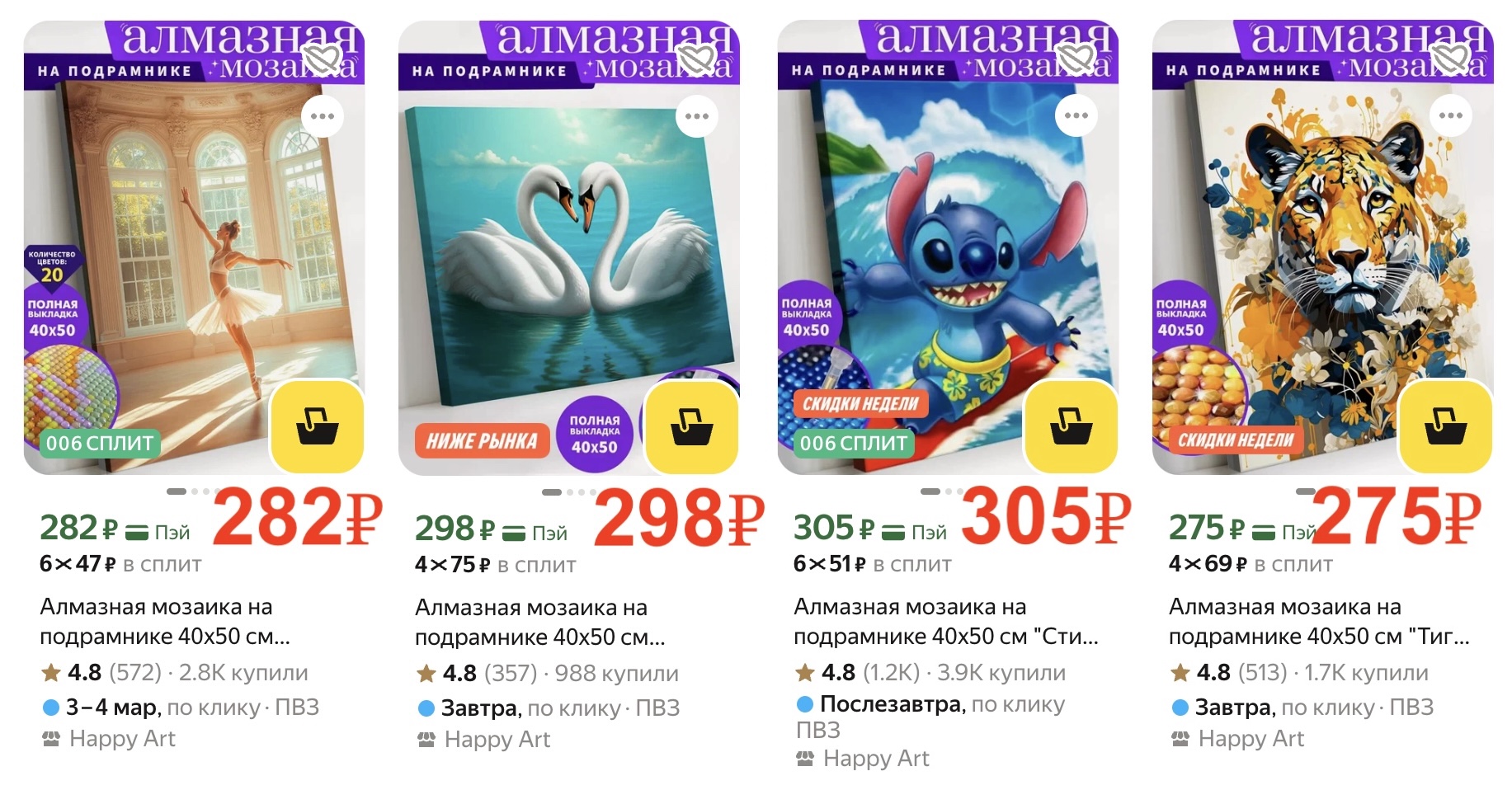 В каталоге различные мозаики размером 40*50 см. В набор входит всё необходимое: крепление для картины, стразы, стилус и лоток для страз. Отличный вариант для творчества и подарка!