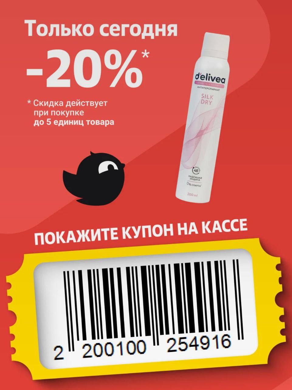 На доставку такой скидки нет, действует только в магазинах на кассе до конца дня. Надо показать штрихкод купона (он общий из приложения Чижик):