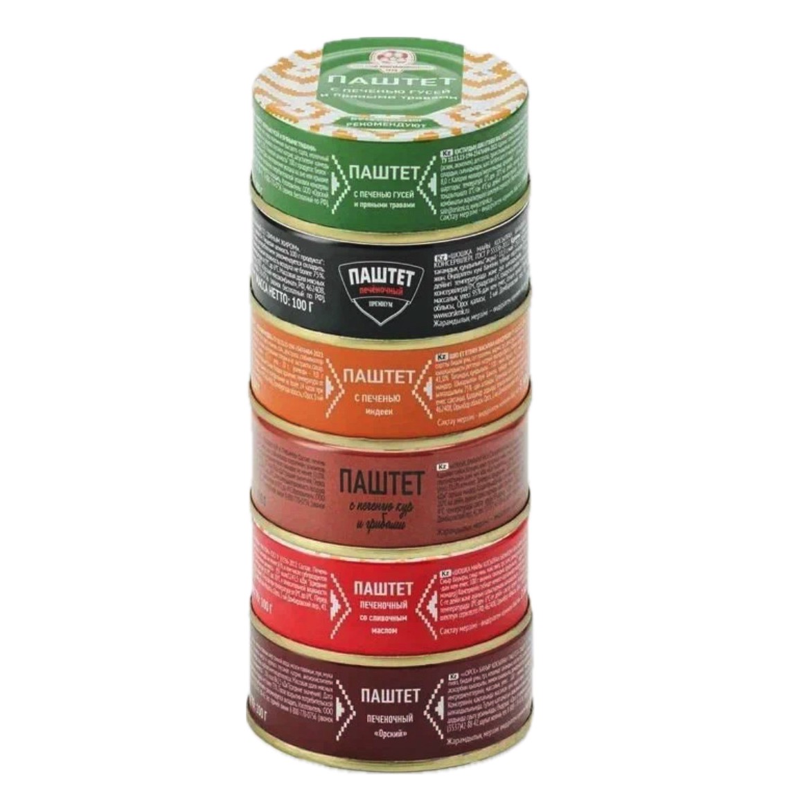 В наборе 12 баночек по 100 г, стоит 854 рубля. Выходит 71 рубль за банку! Внутри 6 видов паштета, и каждого по 2 банки: