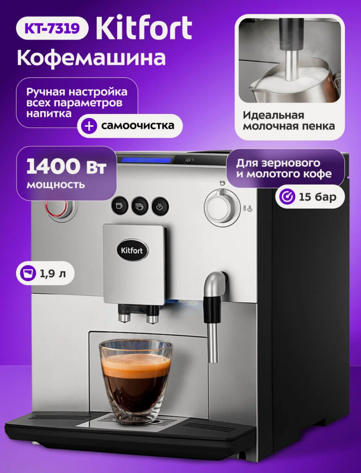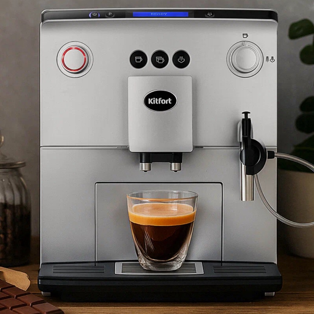 Подойдет для приготовления эспрессо, американо и капучино. Оснащена капучинатором, регулируемой по высоте подставкой для чашек и контейнером для зёрен на 250 г. Мощность 1450 Вт, давление помпы 20 бар. Компактный корпус, управление кнопками.