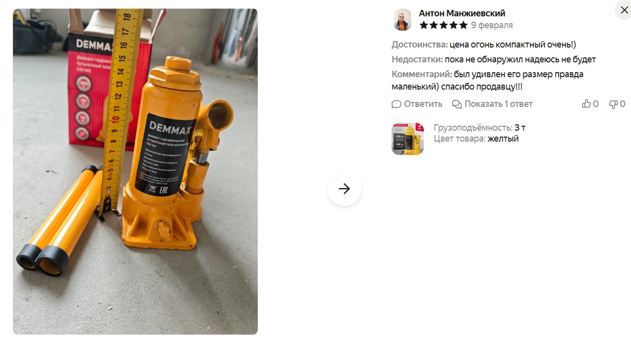 Гидравлика работает плавно, без рывков. За 698 рублей на Яндекс Маркете - бюджетный вариант для гаража или багажника, чтобы колесо поменять по надобности.