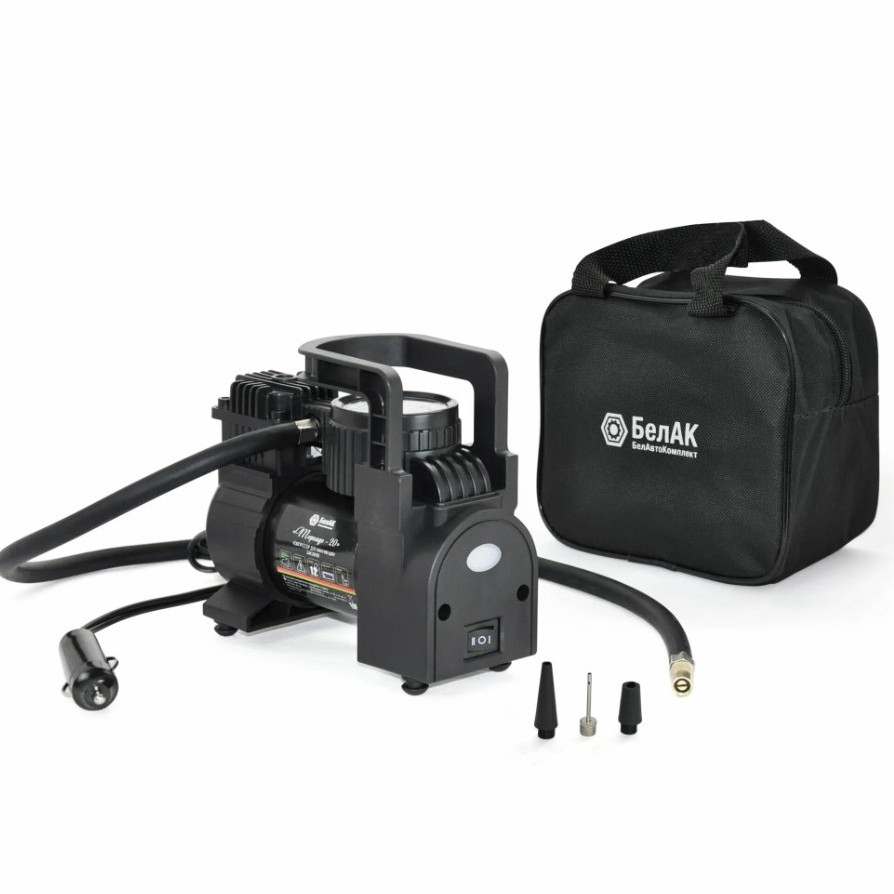 Привет. На Маркете автомобильный насос БелАК БАК.99169 за 1003₽. Мощность 100 Вт, выдаёт до 6 атм, производительность 35 л/мин. Работает от прикуривателя, кабель 2,8 м, шланг 1,2 м. Есть подсветка, аналоговый манометр, защита от КЗ. Корпус из морозостойкого пластика, в комплекте три насадки и сумка для хранения.