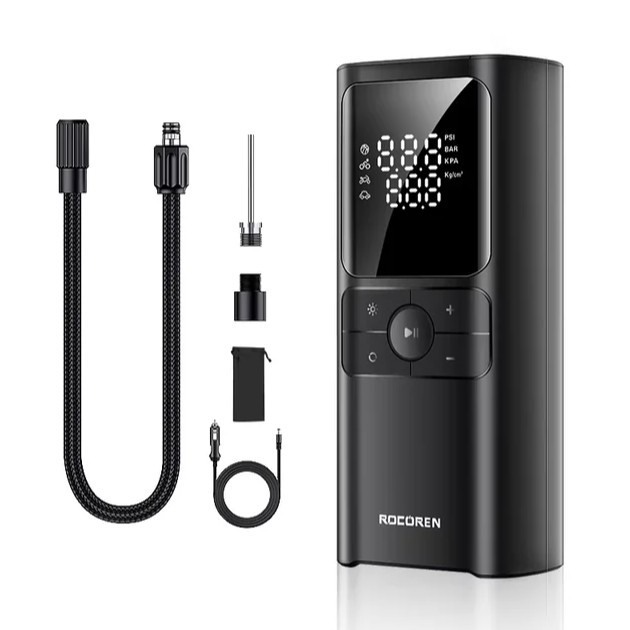 Накачивает колесо до 2.5 бар примерно за 1.5 минуты. 5 режимов (авто, велосипед, мяч и др.) с автоматической остановкой при достижении нужного давления. LED-фонарь с тремя режимами, дисплей, в комплекте насадки, зарядный кабель и чехол.