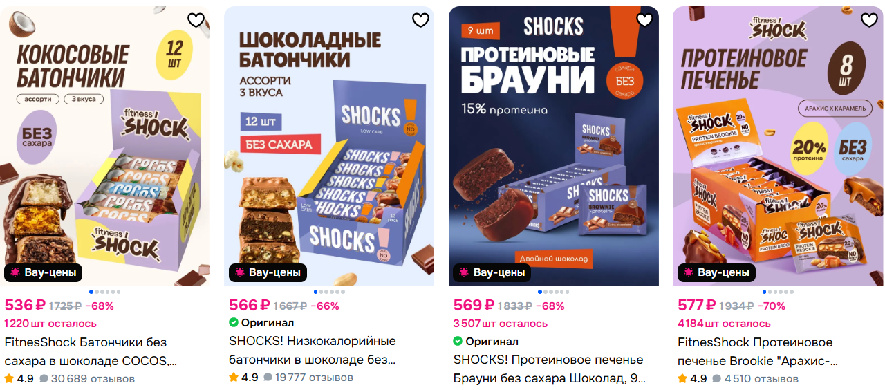 Сейчас у FitnesShock можно удачно взять батончики и печенье без сахара. Главный лайфхак - использовать 150 бонусов продавца и скидку 10% от суммы заказа от 1499₽. Плюс цены уже с учётом Ozon карты. Бонусы начисляются за покупку и тратятся у этого же продавца (до 25% от стоимости)