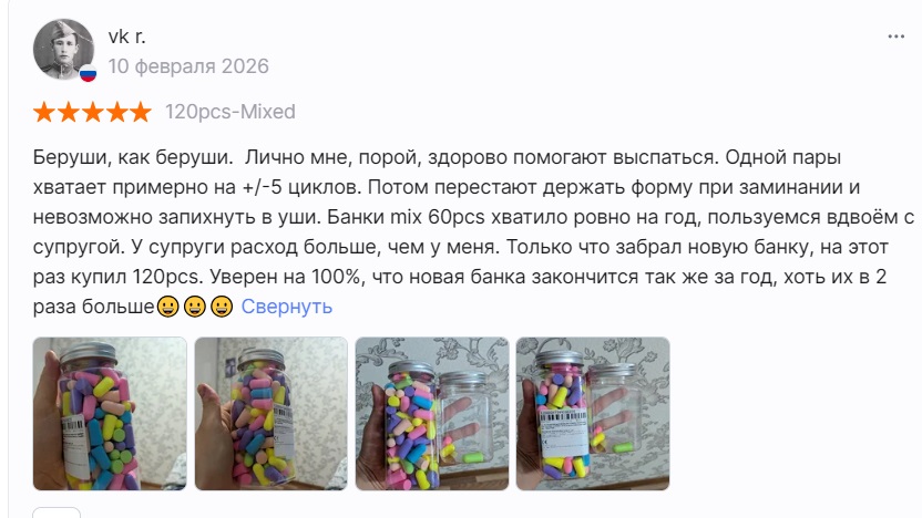 Хорошая цена. Спасают от шумных соседей в гостинице (или собственных детей). Можно брать сразу на всю семью или компанию - в наборе 6 расцветок. Можно использовать повторно.